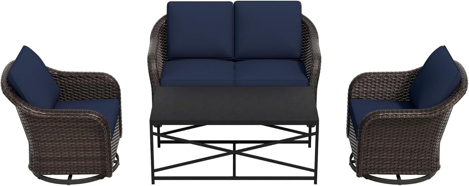 4 Pieces Outdoor Patio Conversation Furniture Set – 55″ PE Rattan Sofa | Coffee Table | 2 Wicker Swivel Glider Chairs, Removble Cushion, Loveseat Couch for Garden, Office (Navy)
