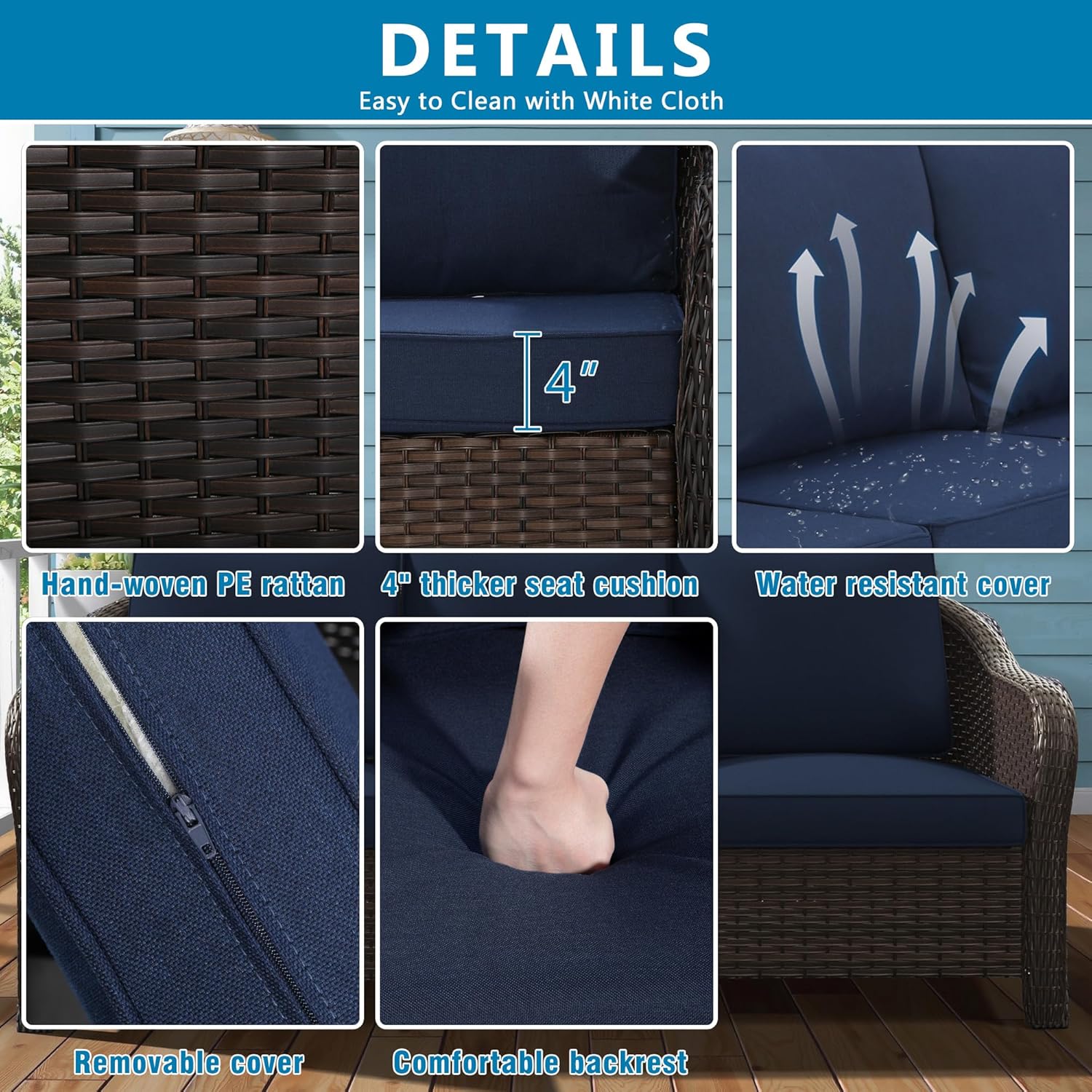 Write an article in French about: 4 Pieces Outdoor Patio Conversation Furniture Set – 55″ PE Rattan Sofa | Coffee Table | 2 Wicker Swivel Glider Chairs, Removble Cushion, Loveseat Couch for Garden, Office (Navy) In English