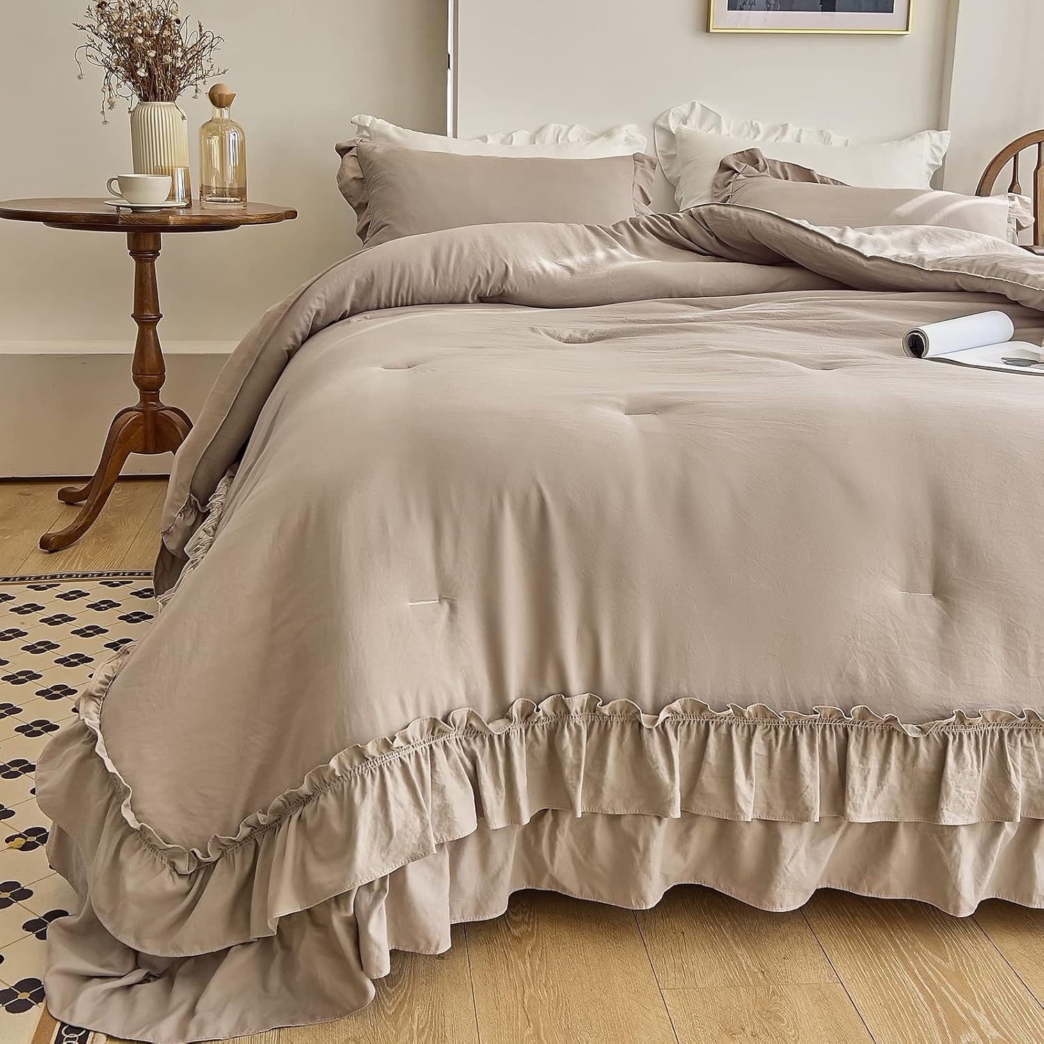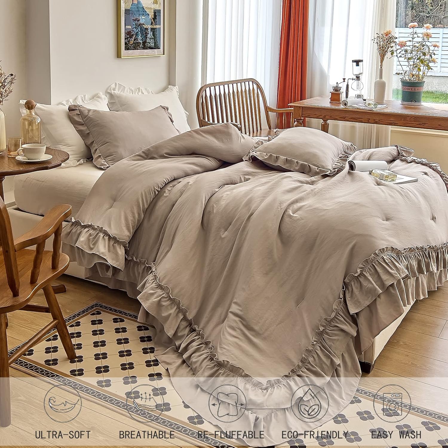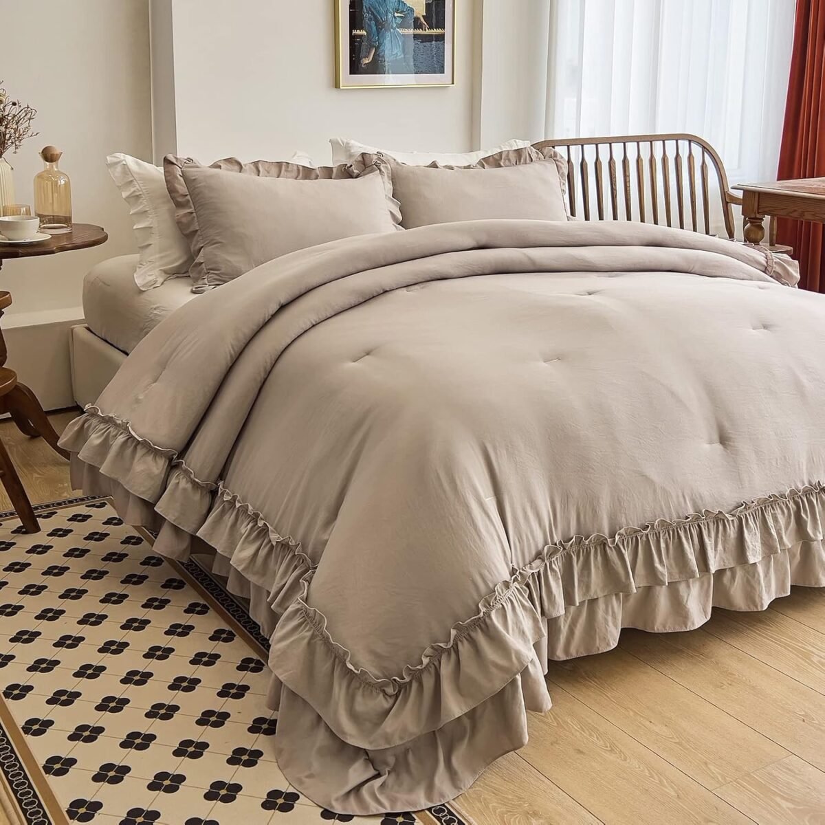 Write an article in French about: AIKASY Taupe Comforters Queen Size Set, Vintage Boho Chic Farmhouse Bedding Sets Shabby Ruffle Queen Bed Comforter Bedding 3PCS(1 Comforter and 2 Pillowcases) In English