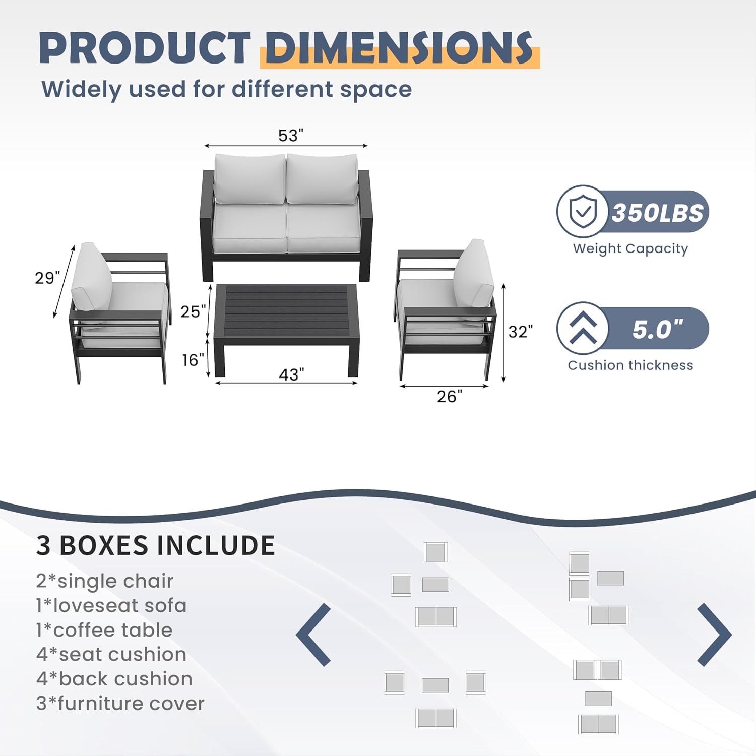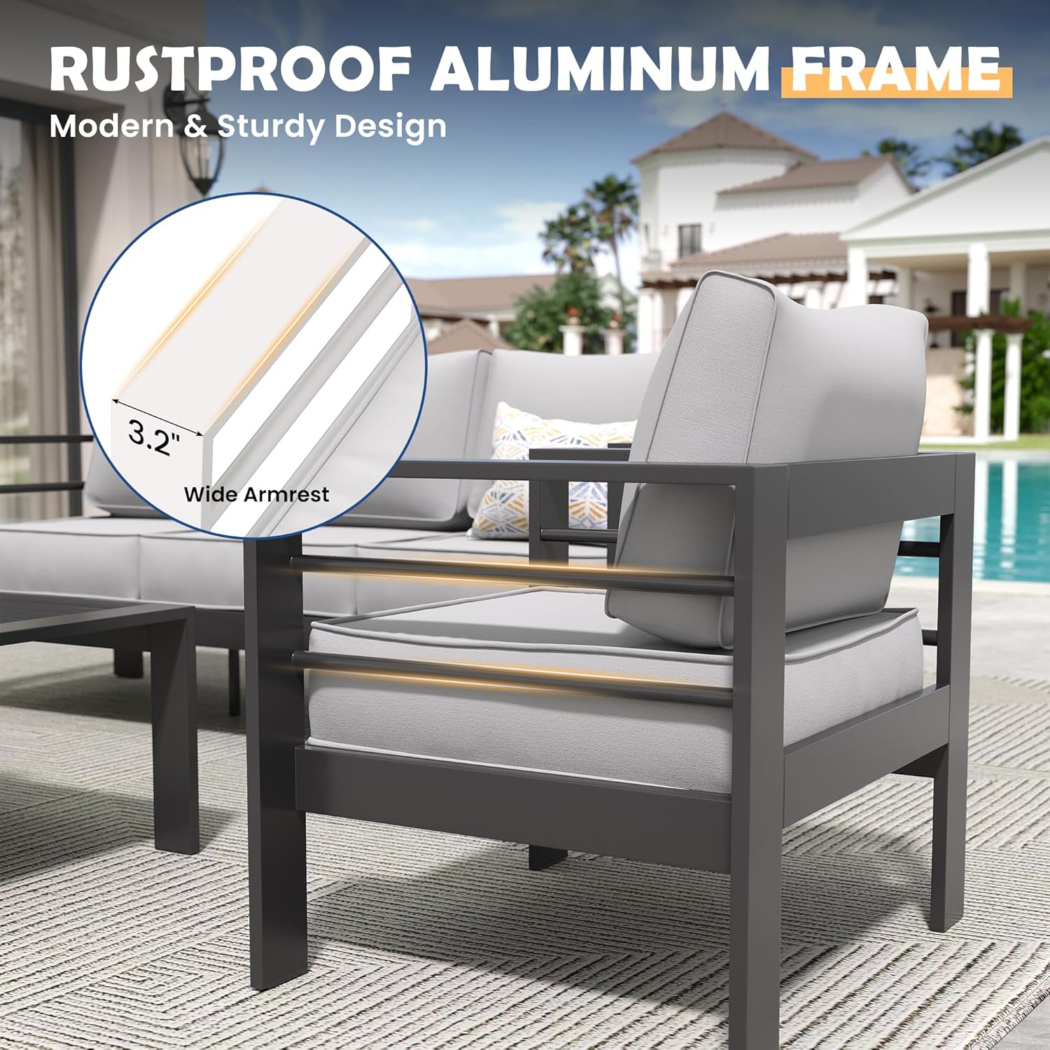 Write an article in French about: Amopatio Aluminum Patio Furniture, 5 Pcs Metal Modern Patio Furniture Set, Outdoor Sectional Sofa for Balcony, Garden (Included Waterproof Covers) In English