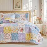 Joyreap Floral Cotton Quilt Set, Colorful Flowers Grid Patchwork Design, 3 Pieces Queen Size Quilt Bedding Set, Soft n Cozy Bedspread Bed Cover for All Season- 90×90 inches