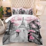 kxry Pink Paris Eiffel Tower Comforter Set Queen Size French Style Couple Lover Flower Bedding Sets for Girls Women Kids Quilted Duvet 1 Comforter + 2 Pillow Cases