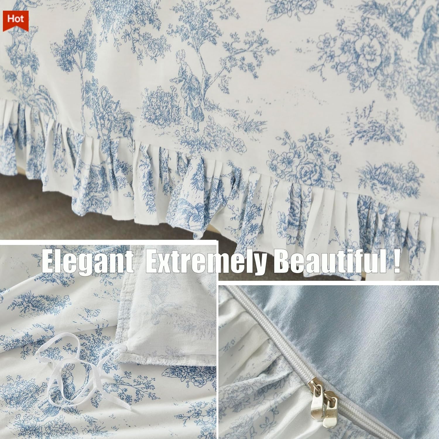 Write an article in French about: Brandream French Country Toile Duvet Cover Set Full Size for Girls Bedroom Vintage Blue Toile Floral Print 100% Cotton Delicate Ruffle Fringe Soft and Breathable, 3 Pieces Bedding with Zipper Closure In English