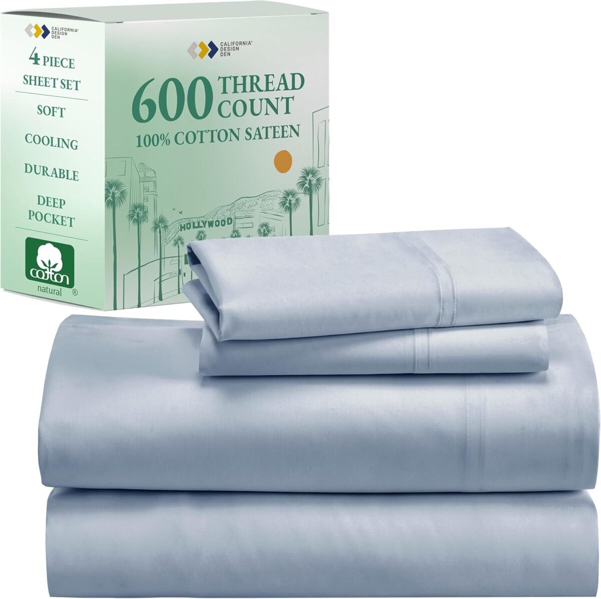 Write an article in French about: California Design Den Luxury Queen Size Sheet Set – 100% Cotton, 600 Thread Count Deep Pocket Queen Sheets, Hotel-Quality Bedding with Sateen Weave – Blue In English