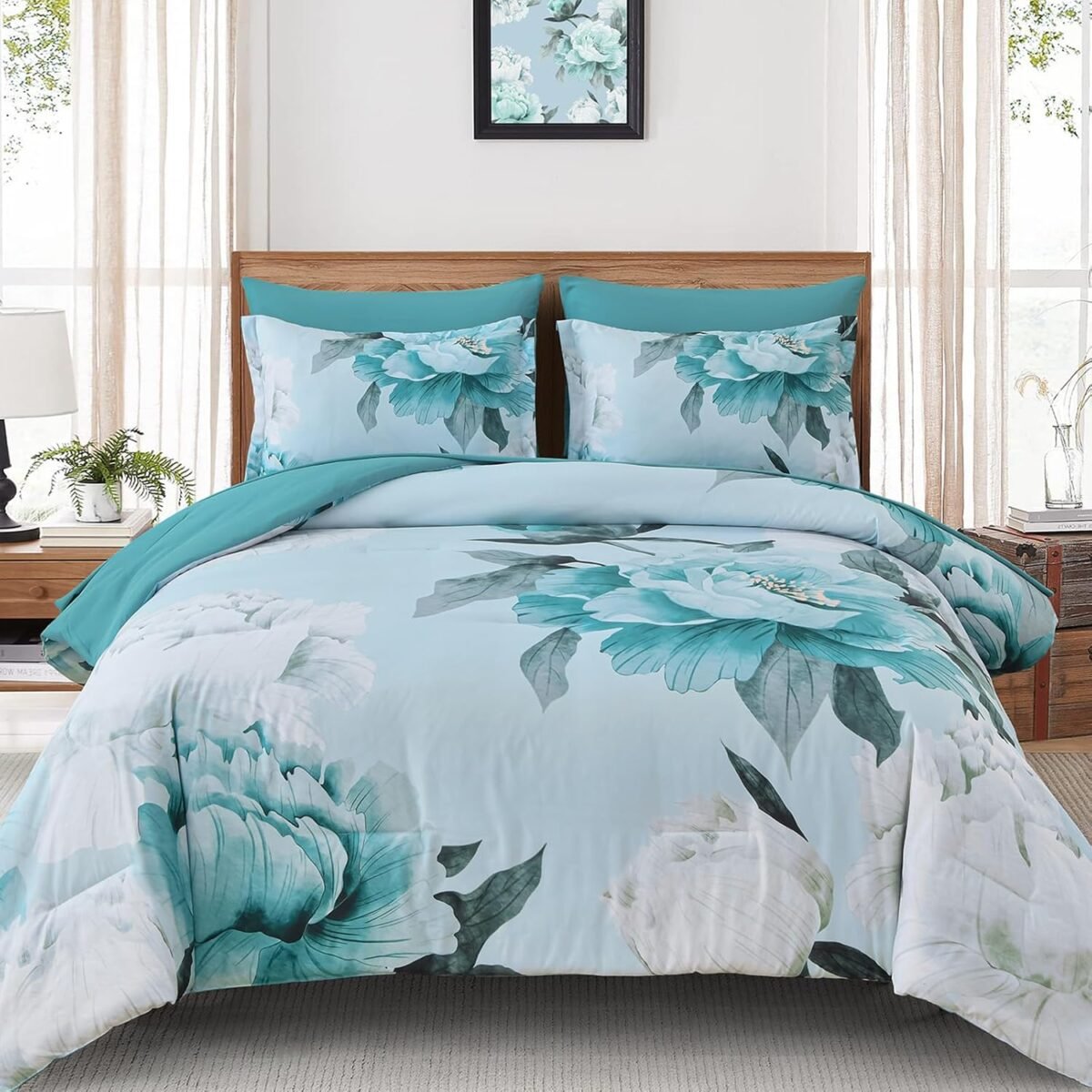 Write an article in French about: Dobuyly Floral Comforter Set Queen Size 7 Piece Bed in a Bag, Aqua Flowers Printed on Light Blue Comforter Set with Sheets, Soft Microfiber Botanical Complete Bedding Set for All Season In English