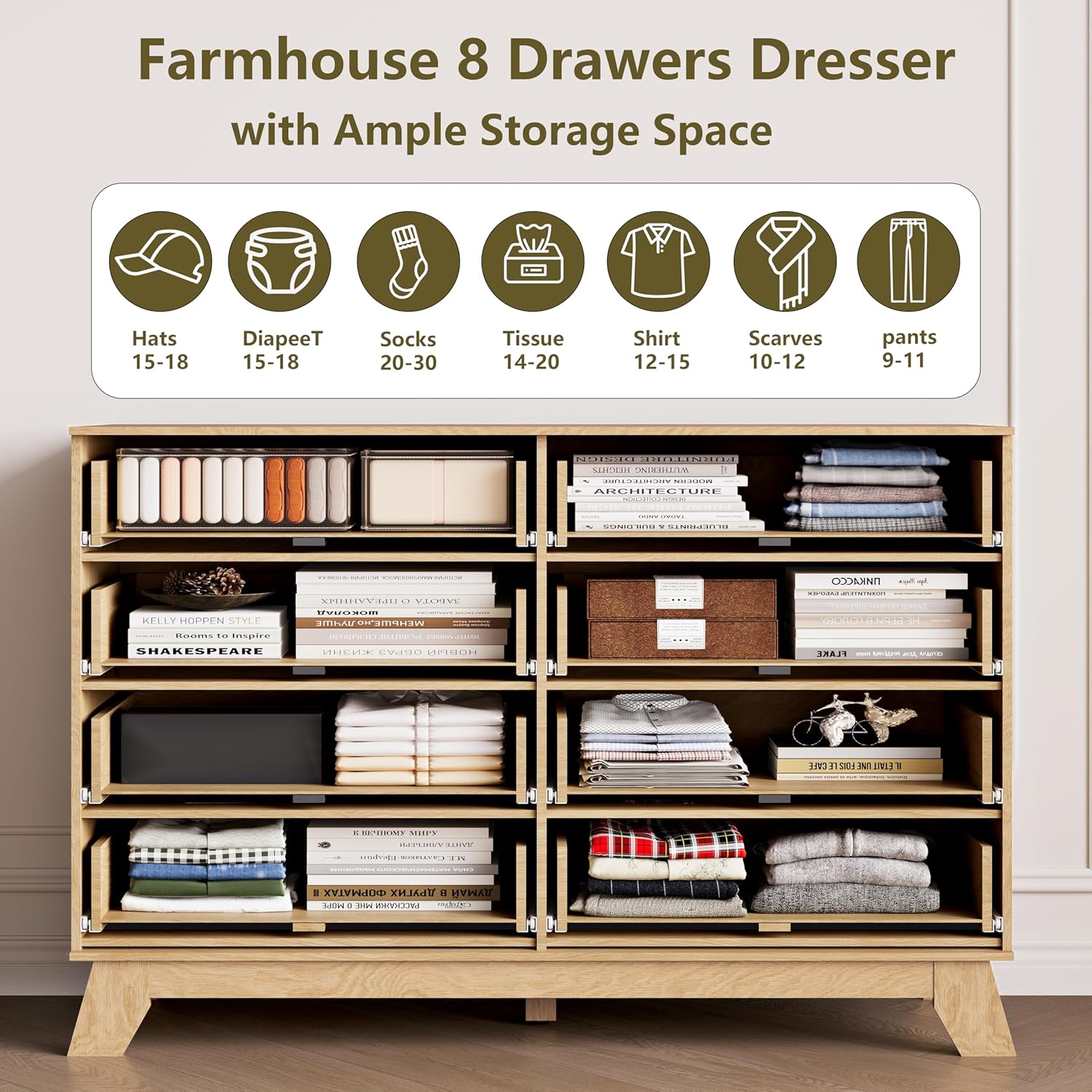 Write an article in French about: Fluted Dresser for Bedroom, 8 Drawer Dressers & Chest of Drawers, Mid Century Modern Dresser for Closet Boho Bedroom Furniture, Nature Wood Chest of Drawers Storage Organizer for Living Room In English