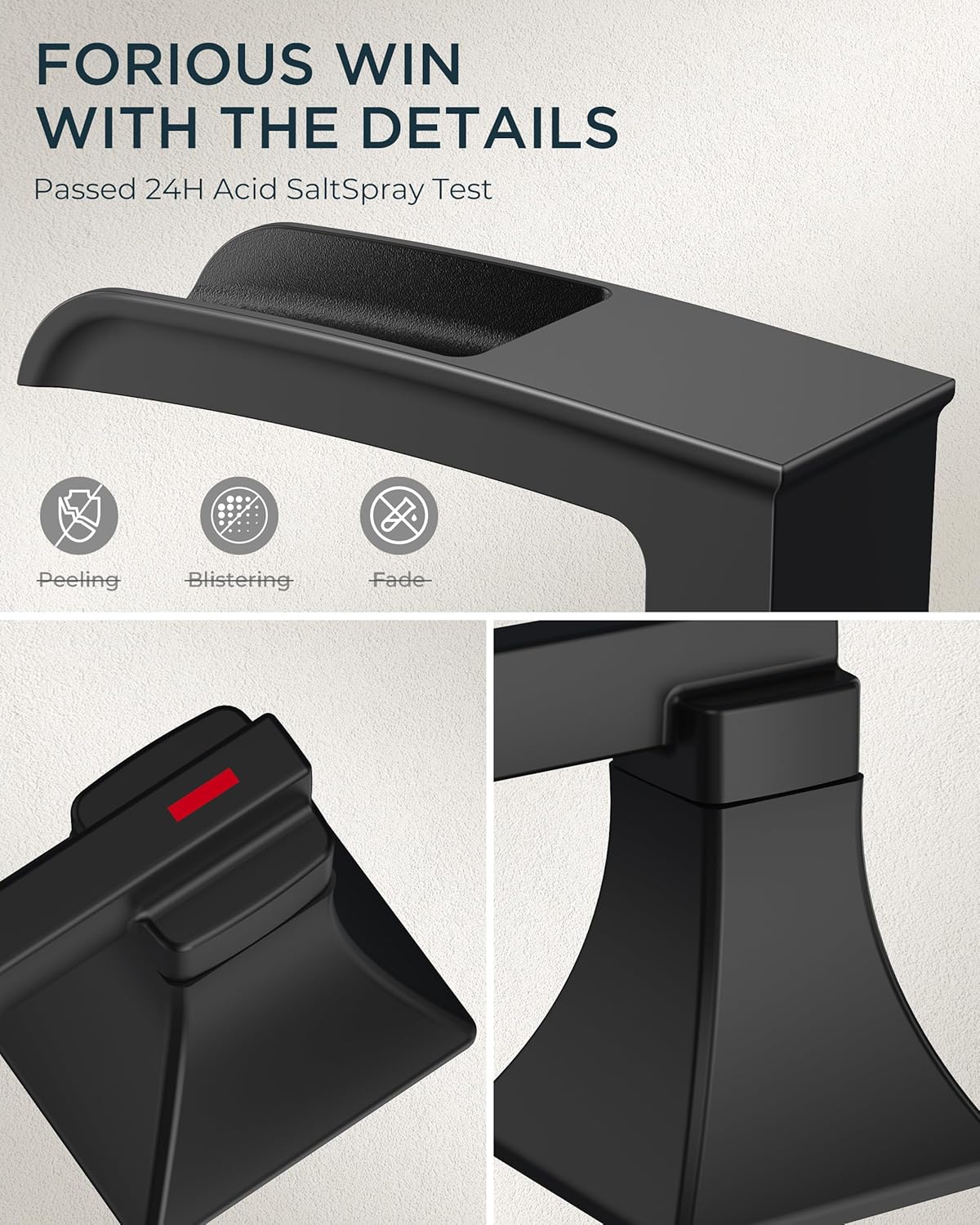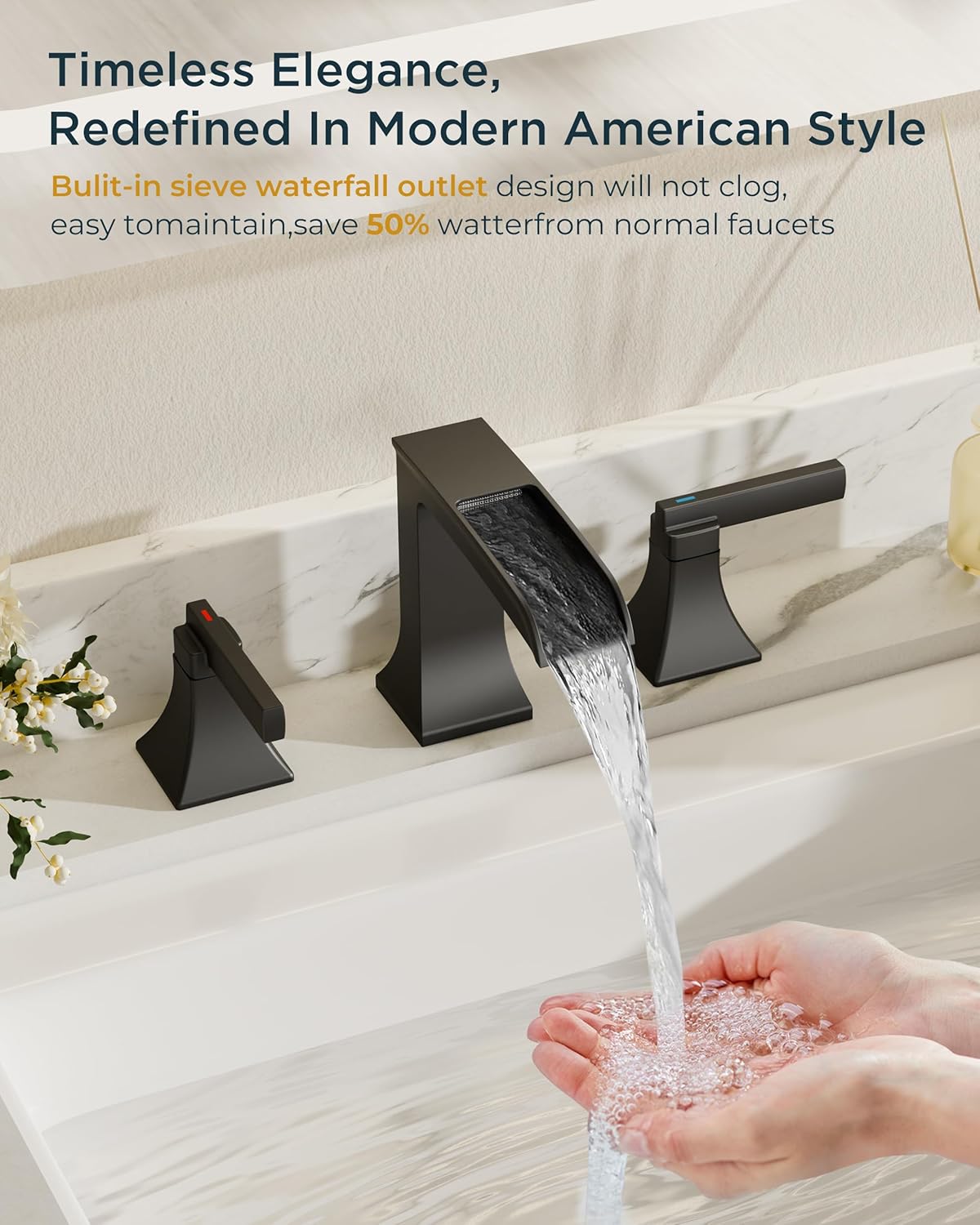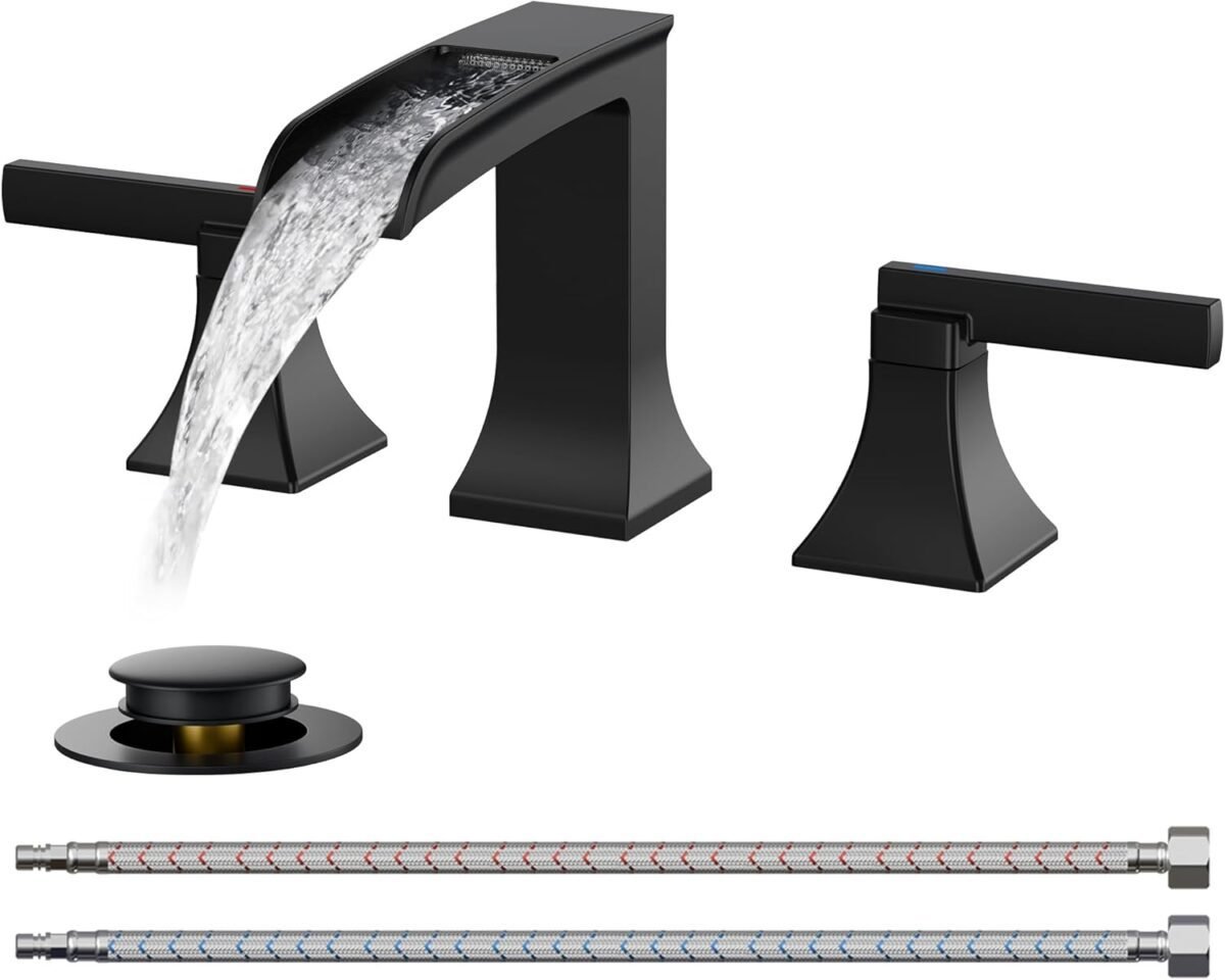 FORIOUS Brass Waterfall Bathroom Faucet for Sink 3 Hole, 2 Handle Square 8 Inch Matte Black Bathroom Faucet Widespread with Pop-up Drain and CUPC Flexible Hoses, Vanity