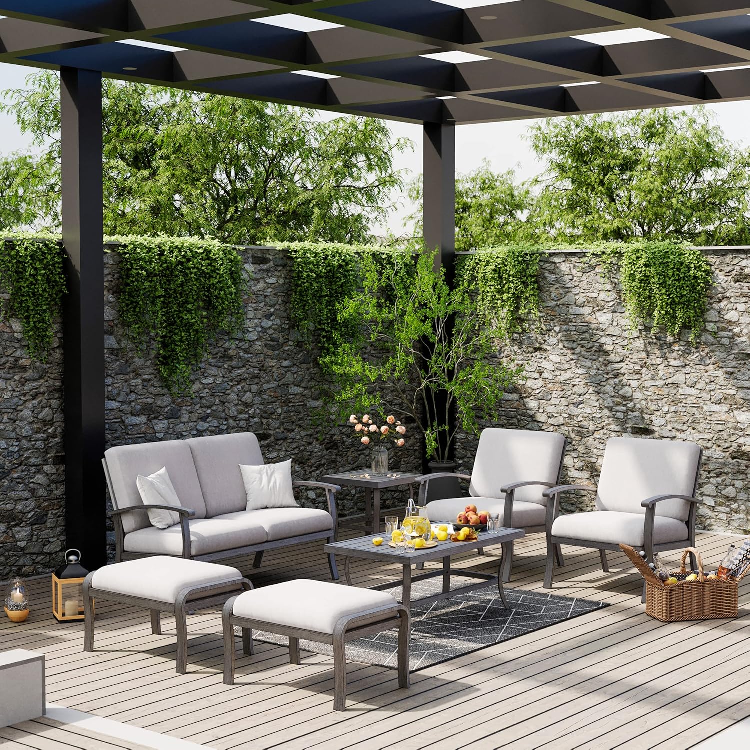 Write an article in French about: HAPPATIO 7 Piece Aluminum Patio Furniture Set, Outdoor Armchairs with Ottomans and Loveseat, Outdoor Sectional Sofa with Side Table and Coffee Table, Garden Conversation Set for Lawn(Gray) In English
