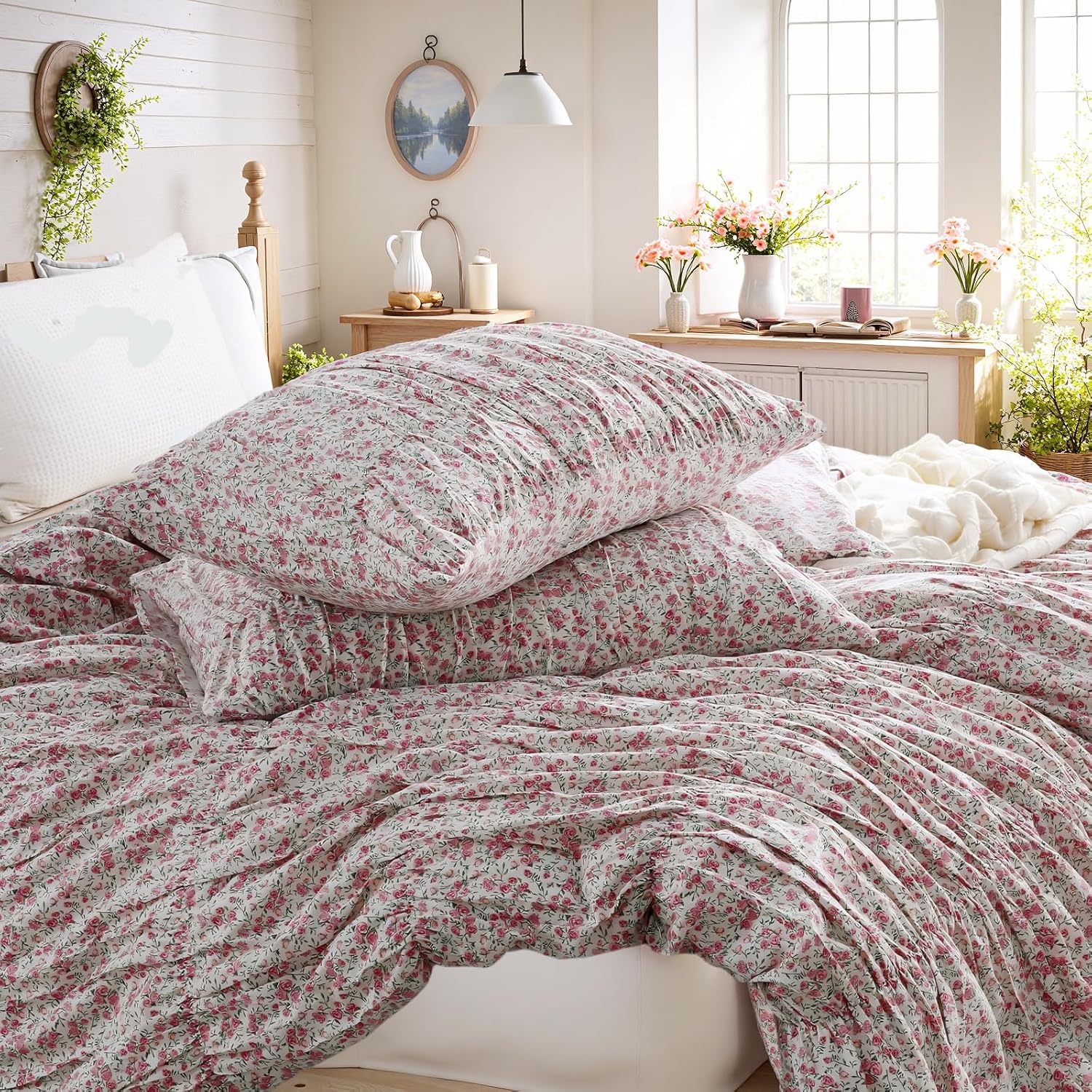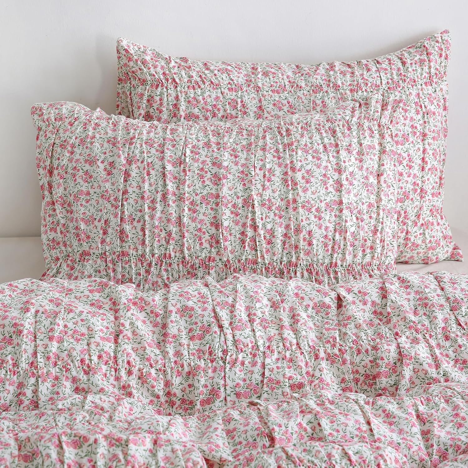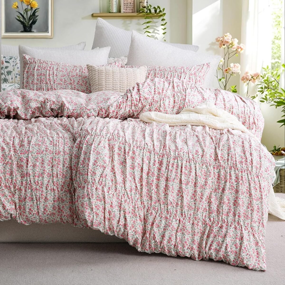 Write an article in French about: Herside Ruched Pink Flower Duvet Cover Queen Size,100% Cotton Reversible Floral Duvet Cover Set with Pocket Closure, 3 Pieces Soft and Breathable Vintage Bedding Set with 2 Pillowcases In English