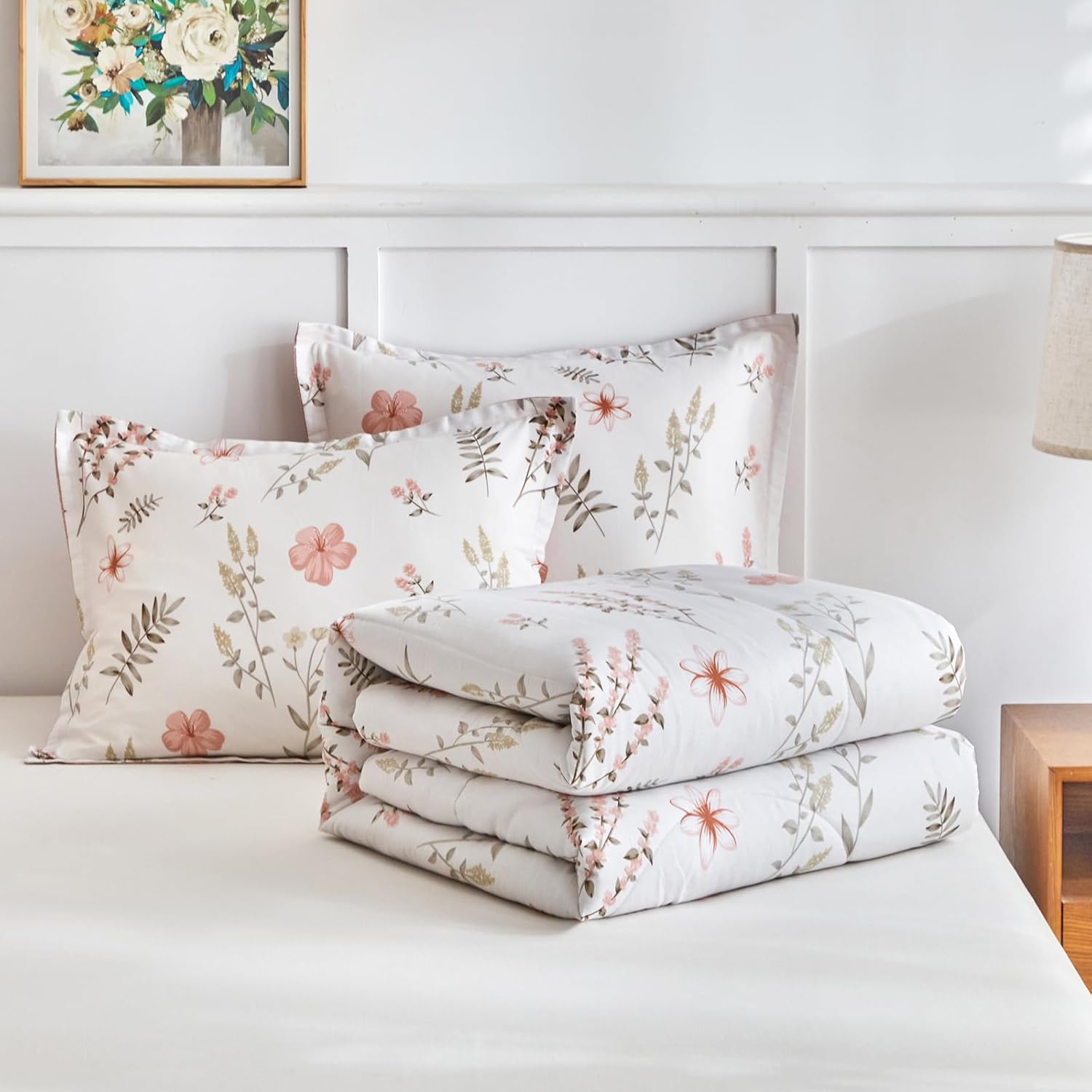 Joyreap 3pcs Floral Cotton Comforter Set for Girls, Pink Flowers n Leaves Botanical Design, Twin Size Soft n Cozy Bedding Comforter Set for All Season- 68×88 inches