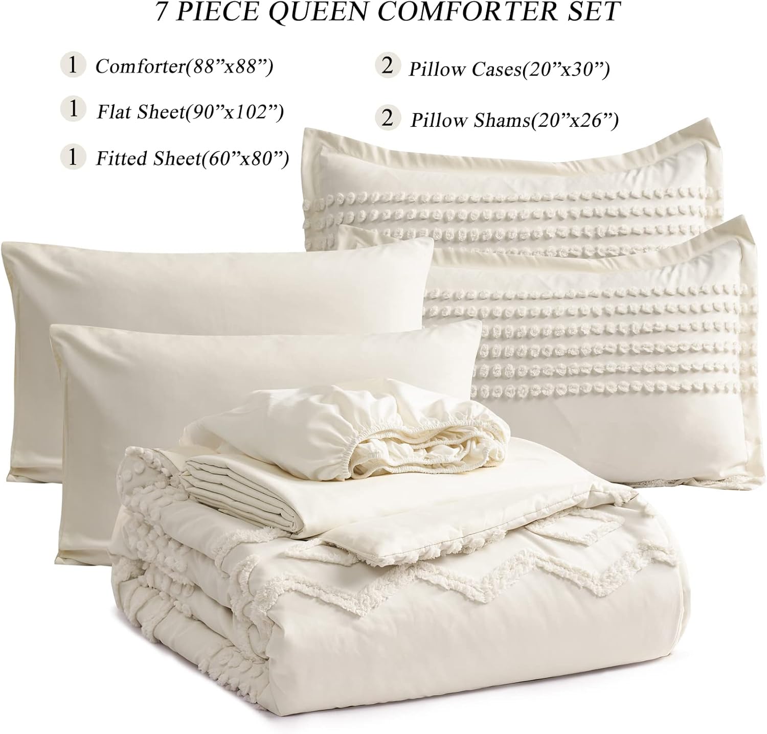 Write an article in French about: KAKIJUMN White Tufted Comforter Set Queen Size 7 Piece Bed in a Bag, Shabby Chic Boho Comforter and Sheet Set, All Season Soft Microfiber Complete Bedding Set(White,Queen) In English