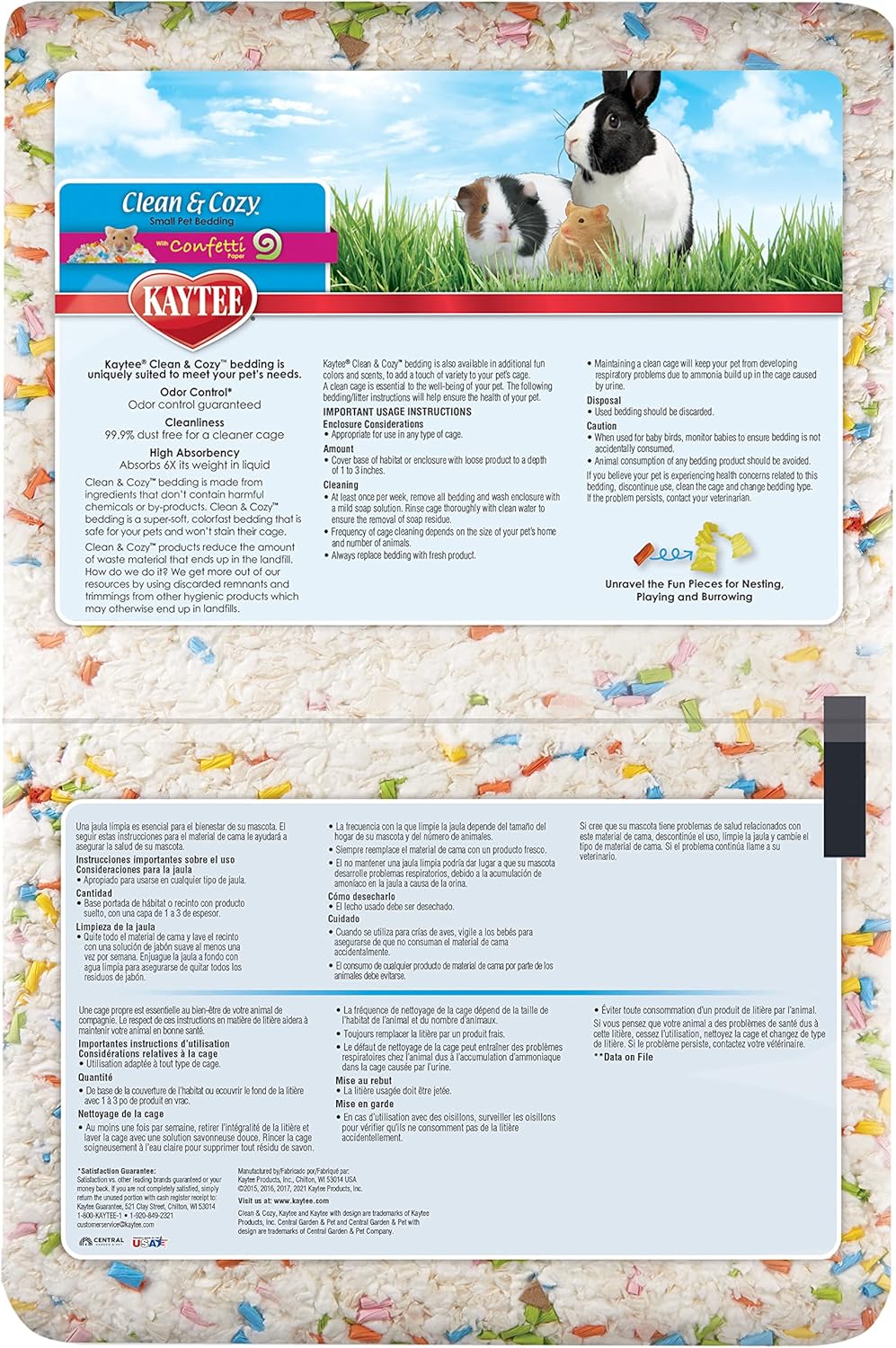 Write an article in French about: Kaytee Clean & Cozy Confetti Bedding for Pet Guinea Pigs, Rabbits, Hamsters, Gerbils, and Chinchillas, 49.2 Liters In English