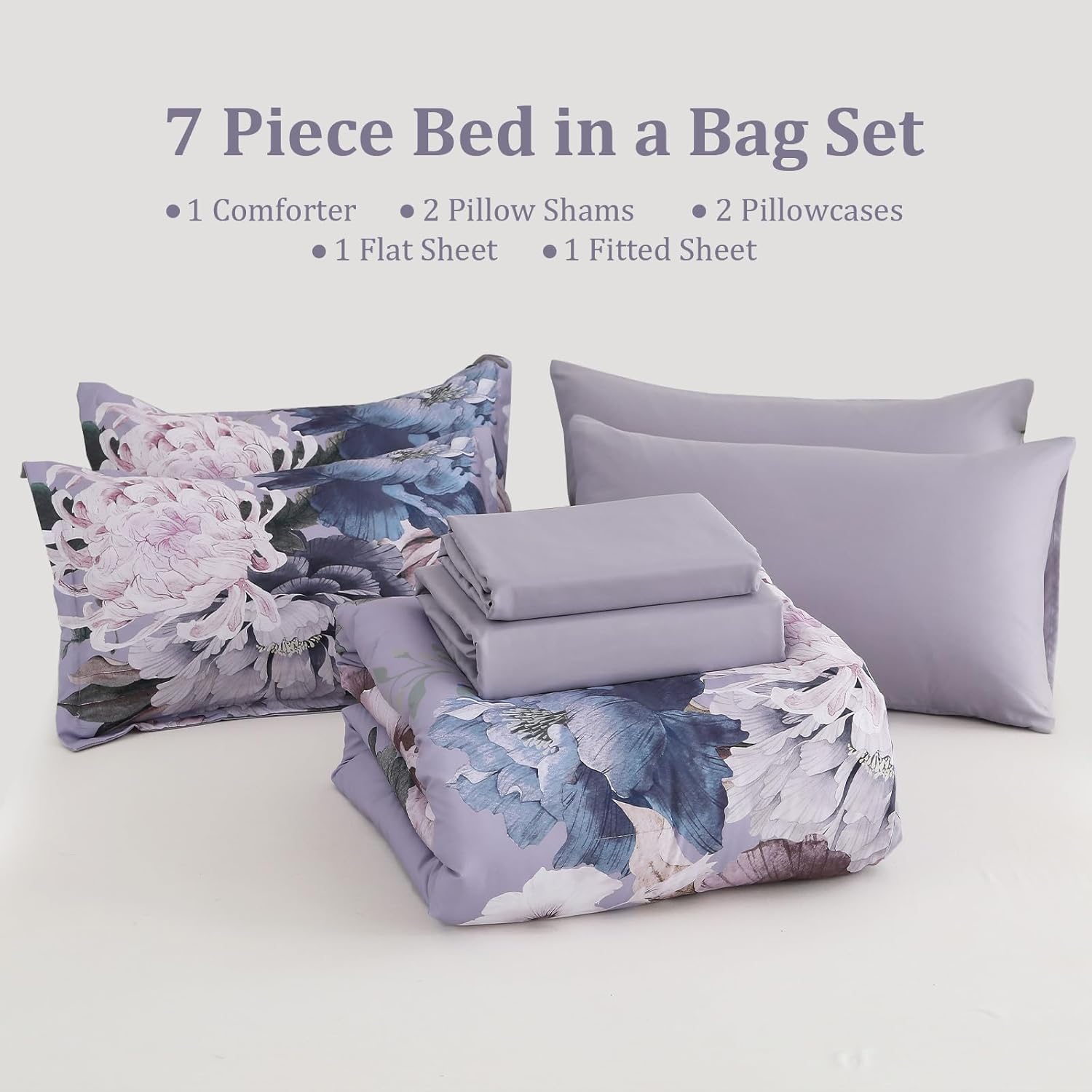 Luxudecor Floral Queen Comforter Set 7 Pieces Bed in a Bag, Flower Print on Lavender Purple Bedding Set, Soft Reversible Comforter with Sheet Set 90″x90″