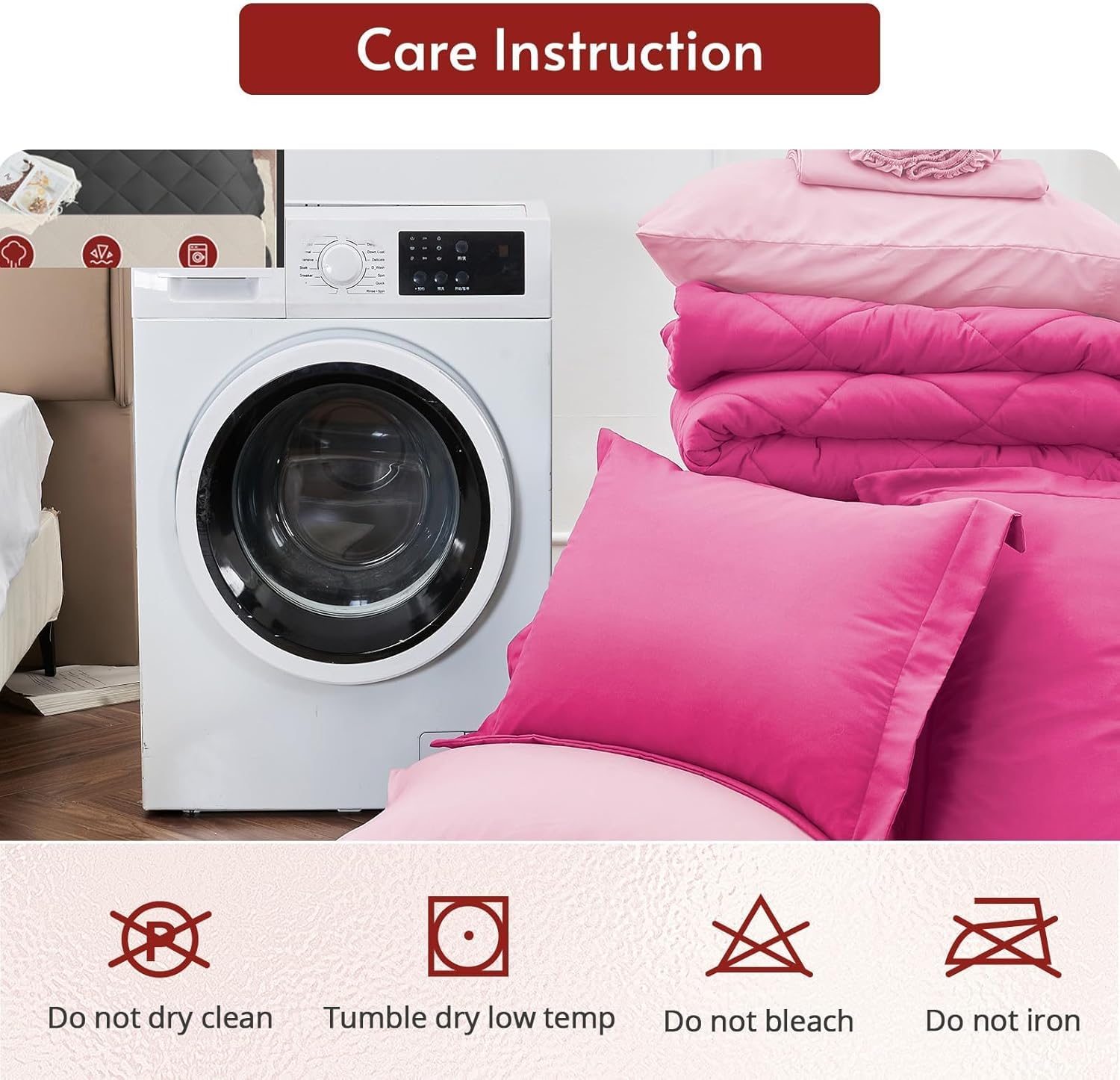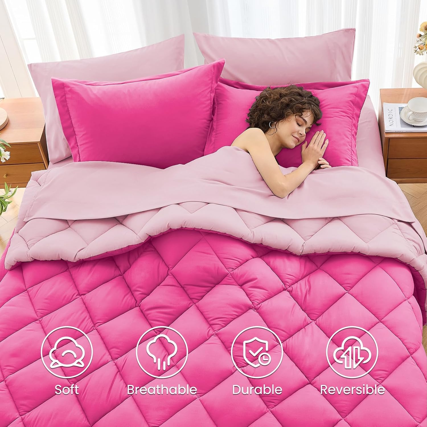 Write an article in French about: MUXHOMO 7 Pieces Queen Comforter Set, Reversible Bed in a Bag Queen Size, All Season Bedding Set with Comforter, Flat Sheet, Fitted Sheet, Pillowcases & Shams, Hot Pink & Baby Pink In English