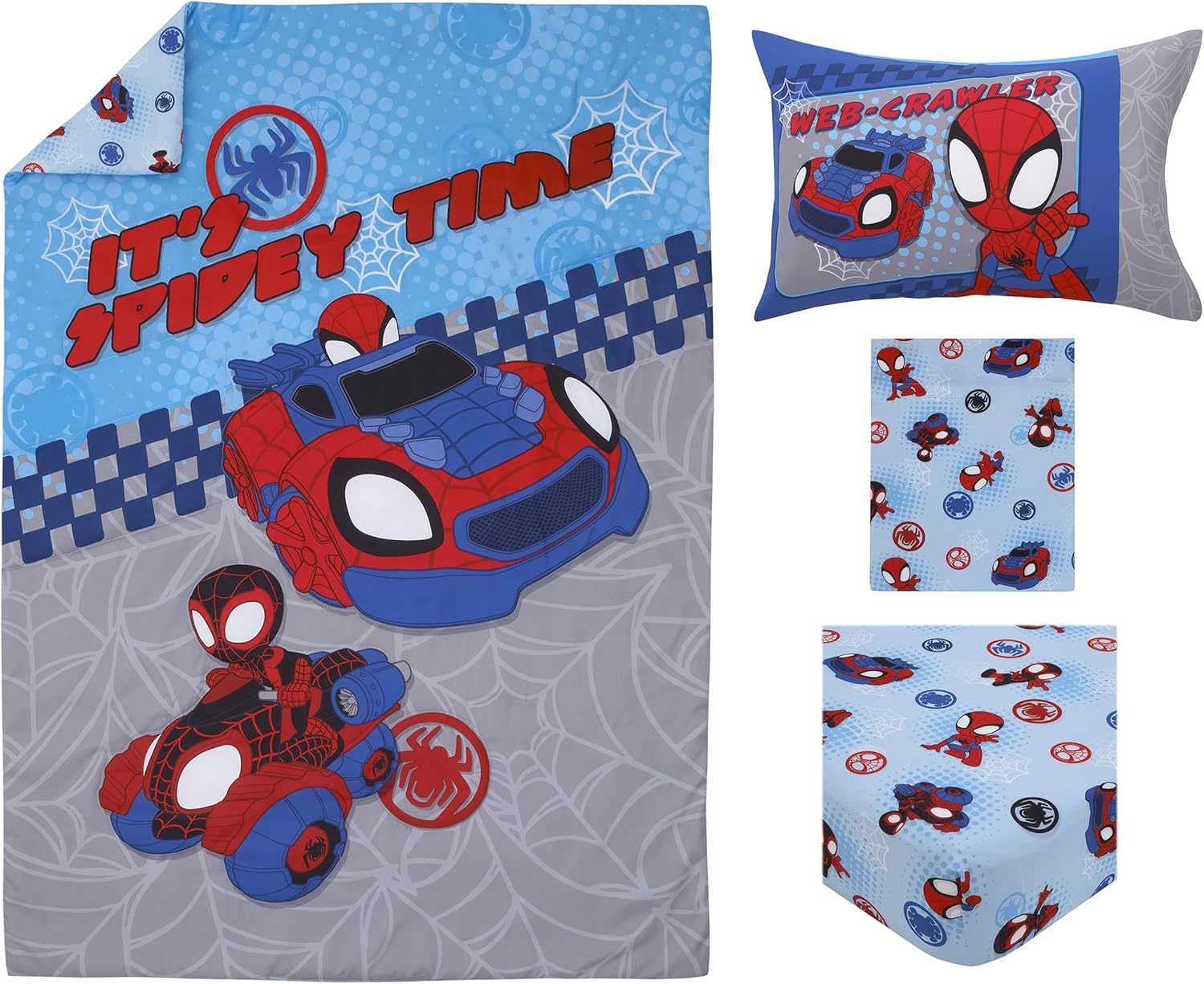 Write an article in French about: NoJo Marvel Spiderman Spidey and his Amazing Friends Spidey Time Red, Blue, and Grey 4 Piece Toddler Bed Set – Comforter, Fitted Bottom Sheet, Flat Top Sheet, and Reversible Pillowcase In English