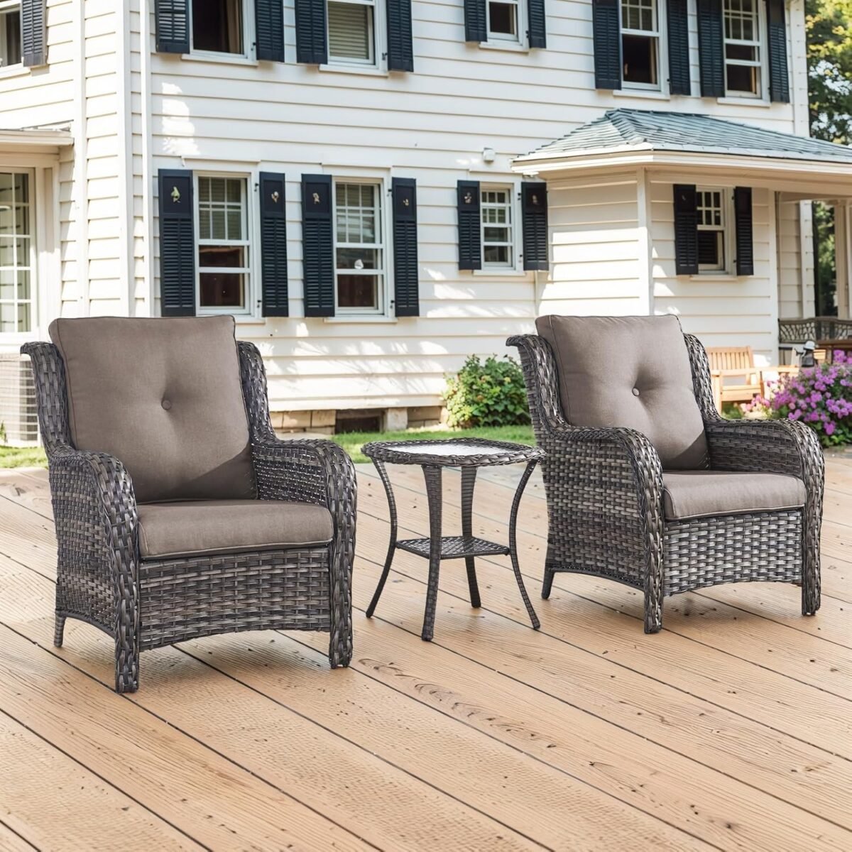 Write an article in French about: Patio Chairs Outdoor Furniture Set, 3 Peices Porch Wicker Furniture with Side Table, Deep Seating Patio Bistro Chair Sets (Grey Cushion) In English