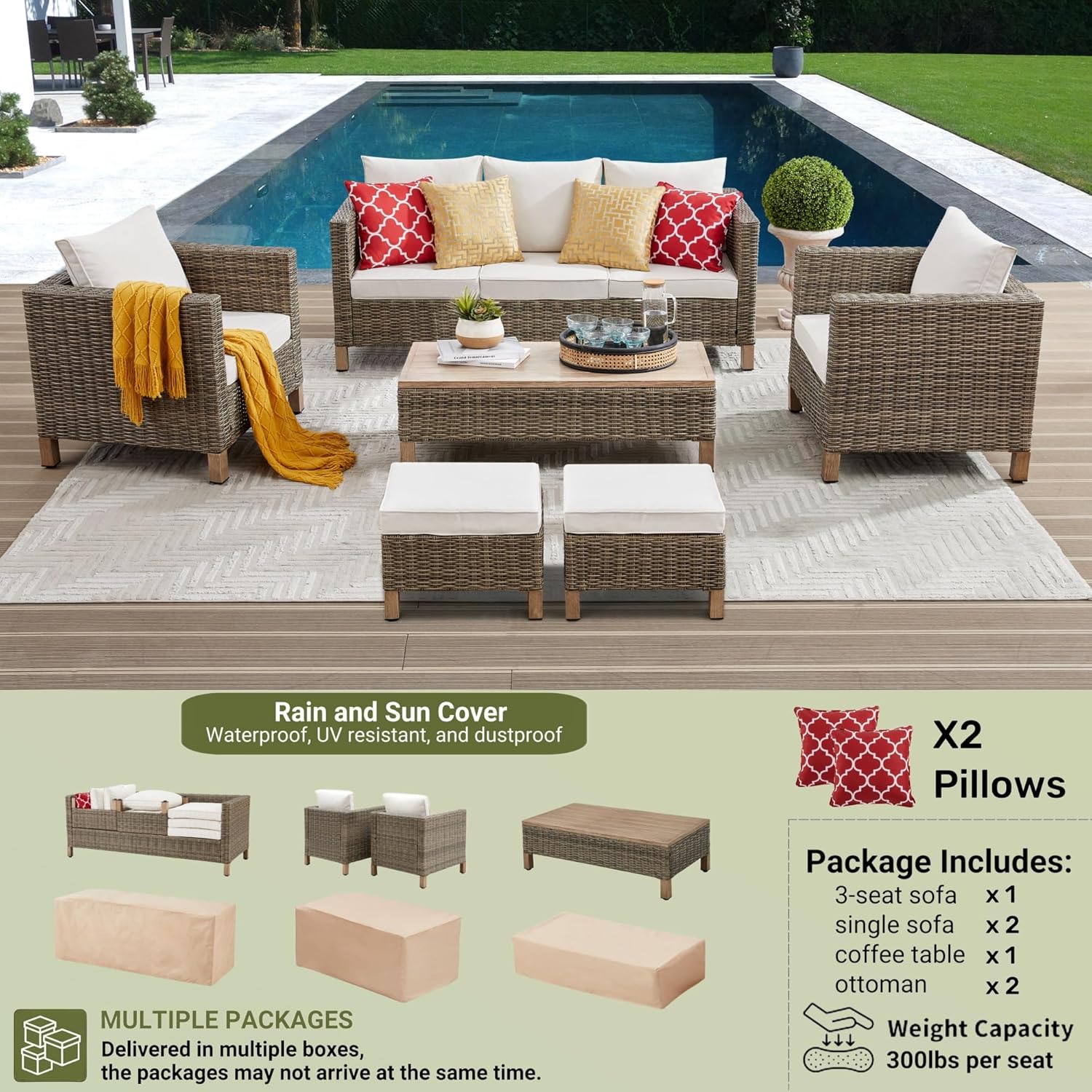Write an article in French about: Patio Furniture Set Sectional Sofa with Metal Top Coffee Table, 6 Pieces Conversation Set Hand Woven Wicker Outdoor Furniture for Garden, Patio, Poolside, Porch Reinforced Rattan Sofa (Beige) In English