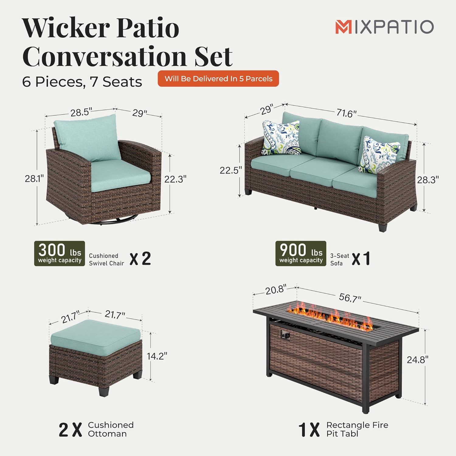 Write an article in French about: Swivel Glider Patio Furniture Set, 6 Pcs Wicker Rattan Outdoor Conversation Set, 2 x Swivel Chairs, 1 x 3 Seater Sofa and 2 x Ottoman with 4″ Thick Cushion and 56″ Fire Pit Table, Blue In English