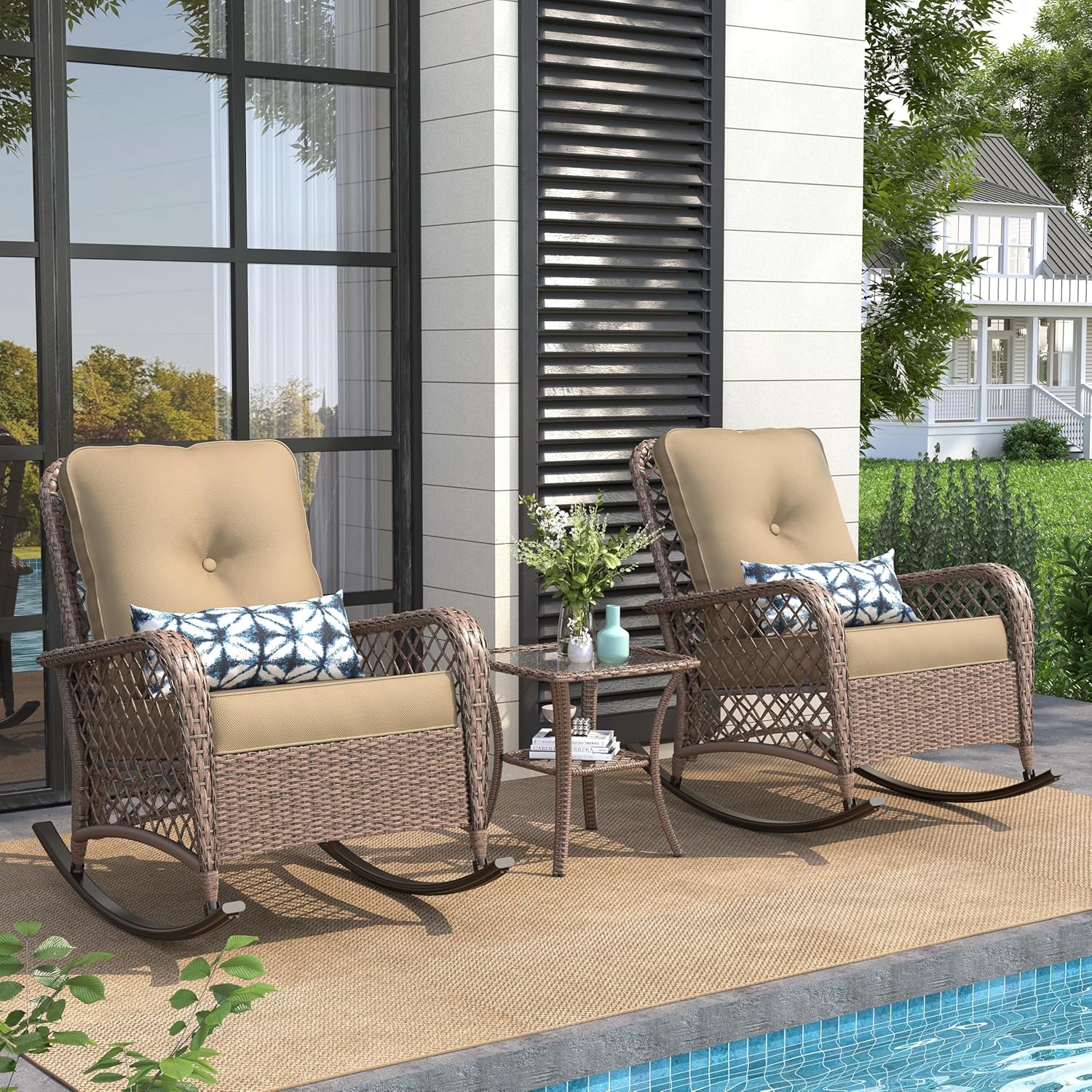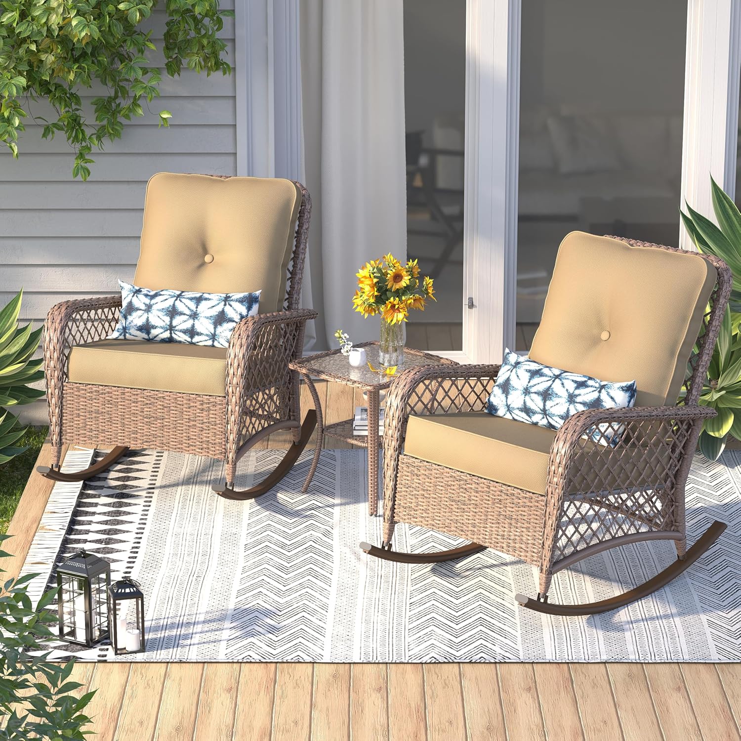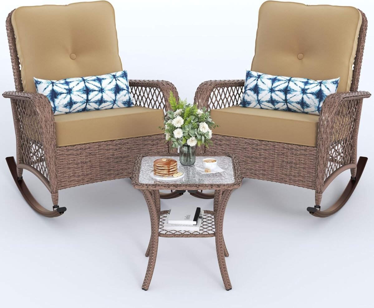 Write an article in French about: UDPATIO 3 Piece Patio Rocking Chair Set, Wicker Outdoor Rocking Bistro Set with 2 Rockers and 1 Side Table with 4‘’ Thick Cushions for Backyard, Porch, Balcony, Poolside, Brown/Khaki In English