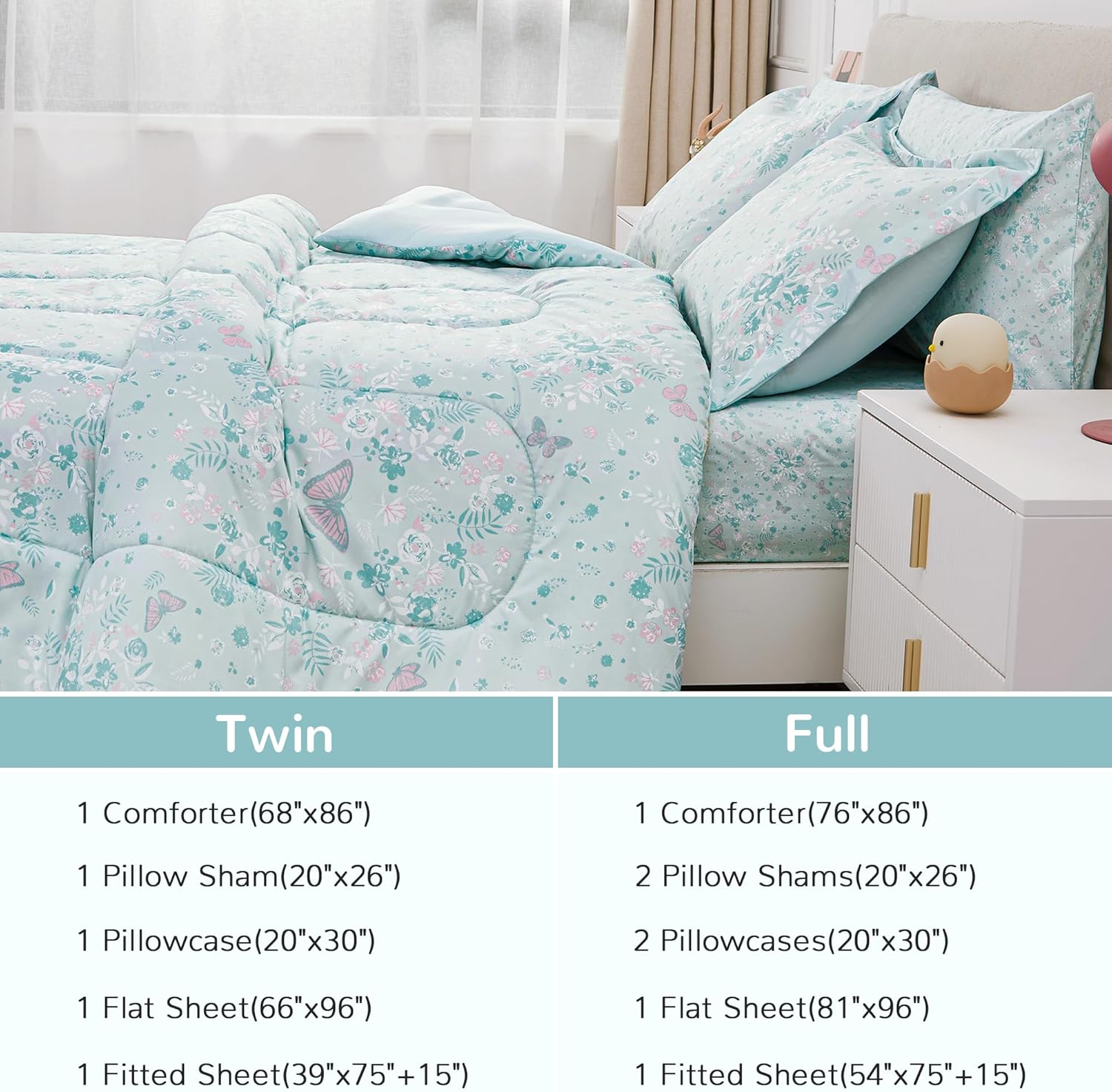 Viviland Twin Butterfly Comforter Set for Girls – Kids Brushed Microfiber Twin Bedding Set – 5 Pieces Machine Washable Bed in A Bag with Soft Comforters, Sheet Set, Shams – Pale Green