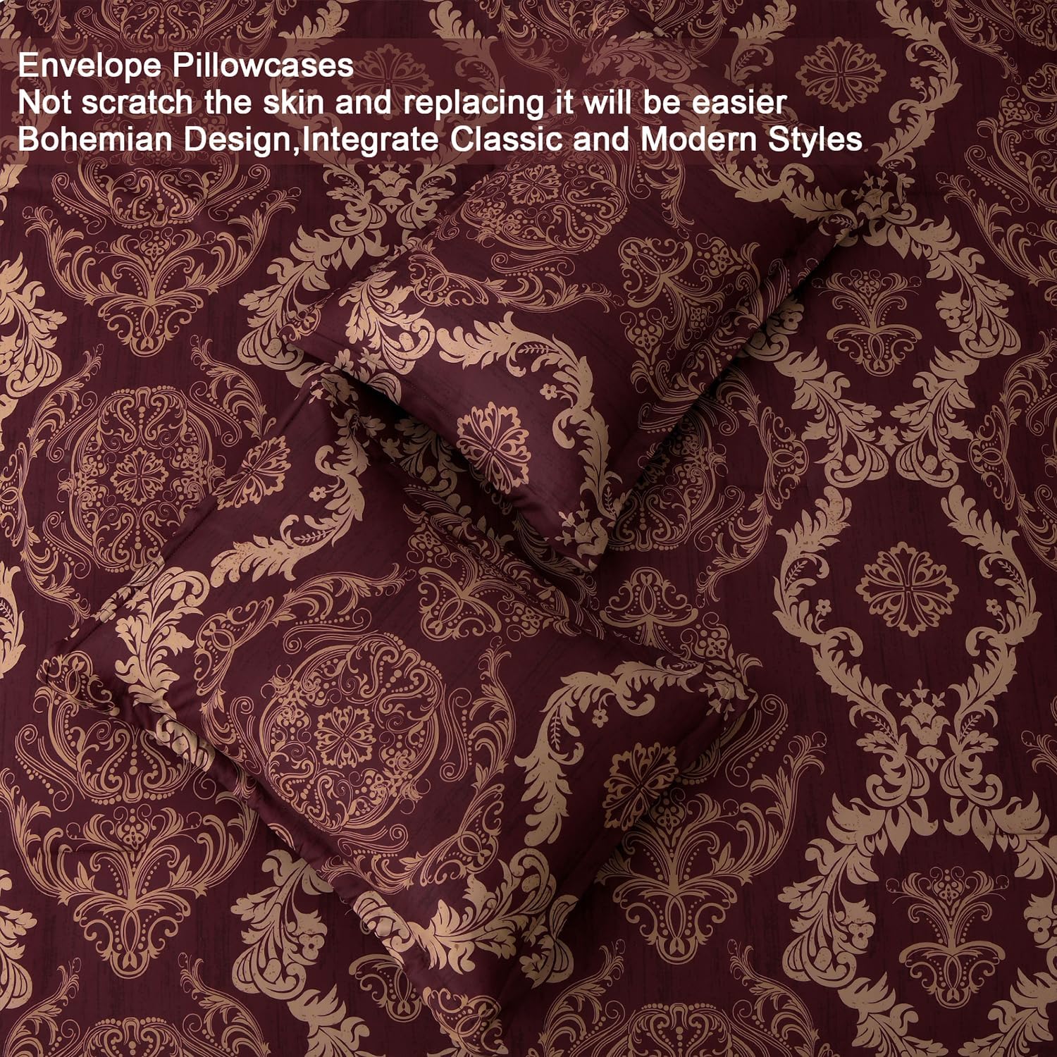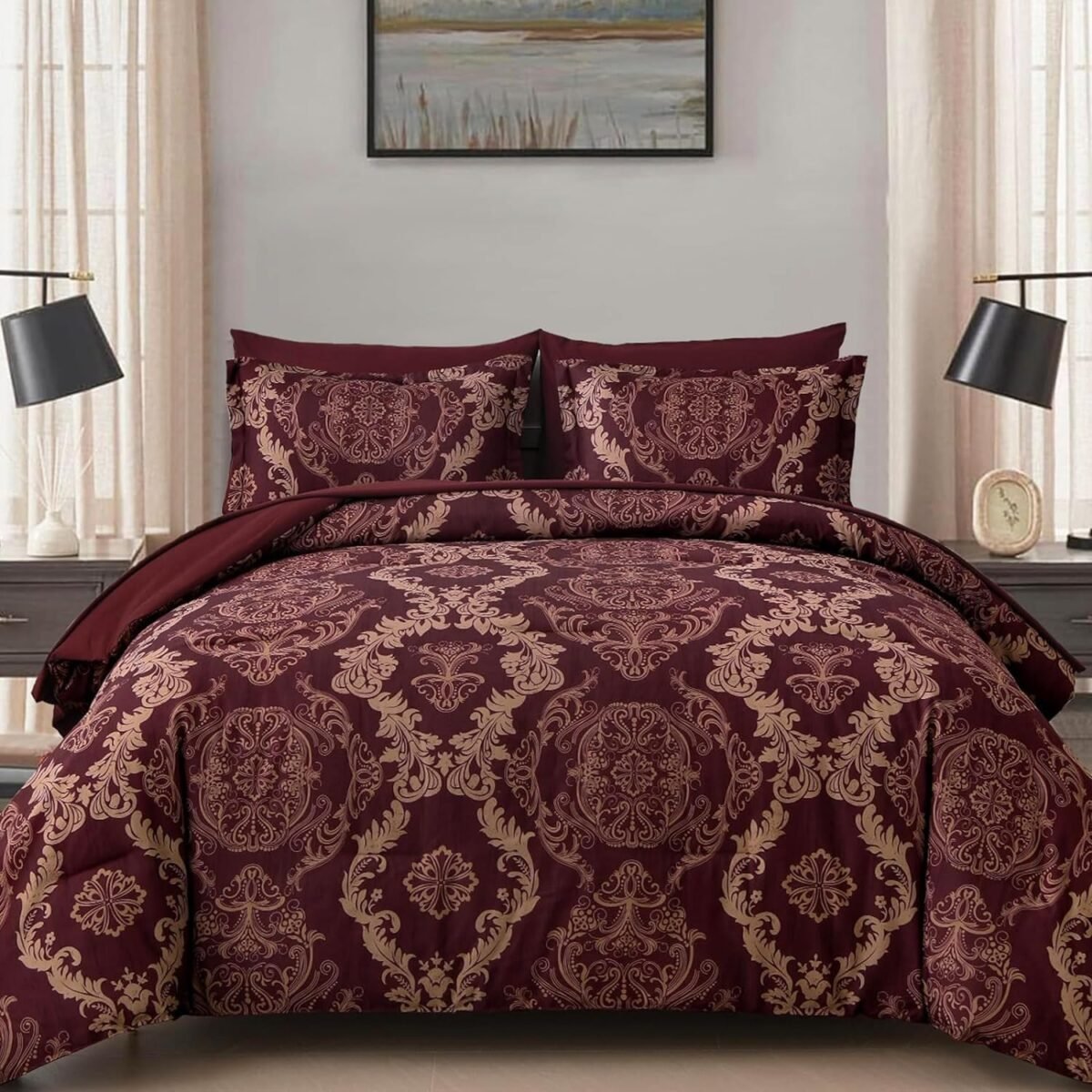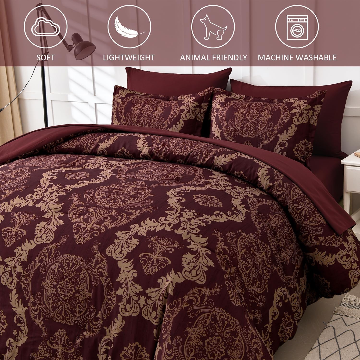Write an article in French about: WONGS BEDDING Burgundy Comforter Set Queen Size, Maroon Damask Texture 7 Pieces Bed in a Bag Microfiber Comforter Bedding Sets -1 Comforter, 1 Flat Sheet, 1 Fitted Sheet, 2 Pillow Shams, 2 Pillowcases In English