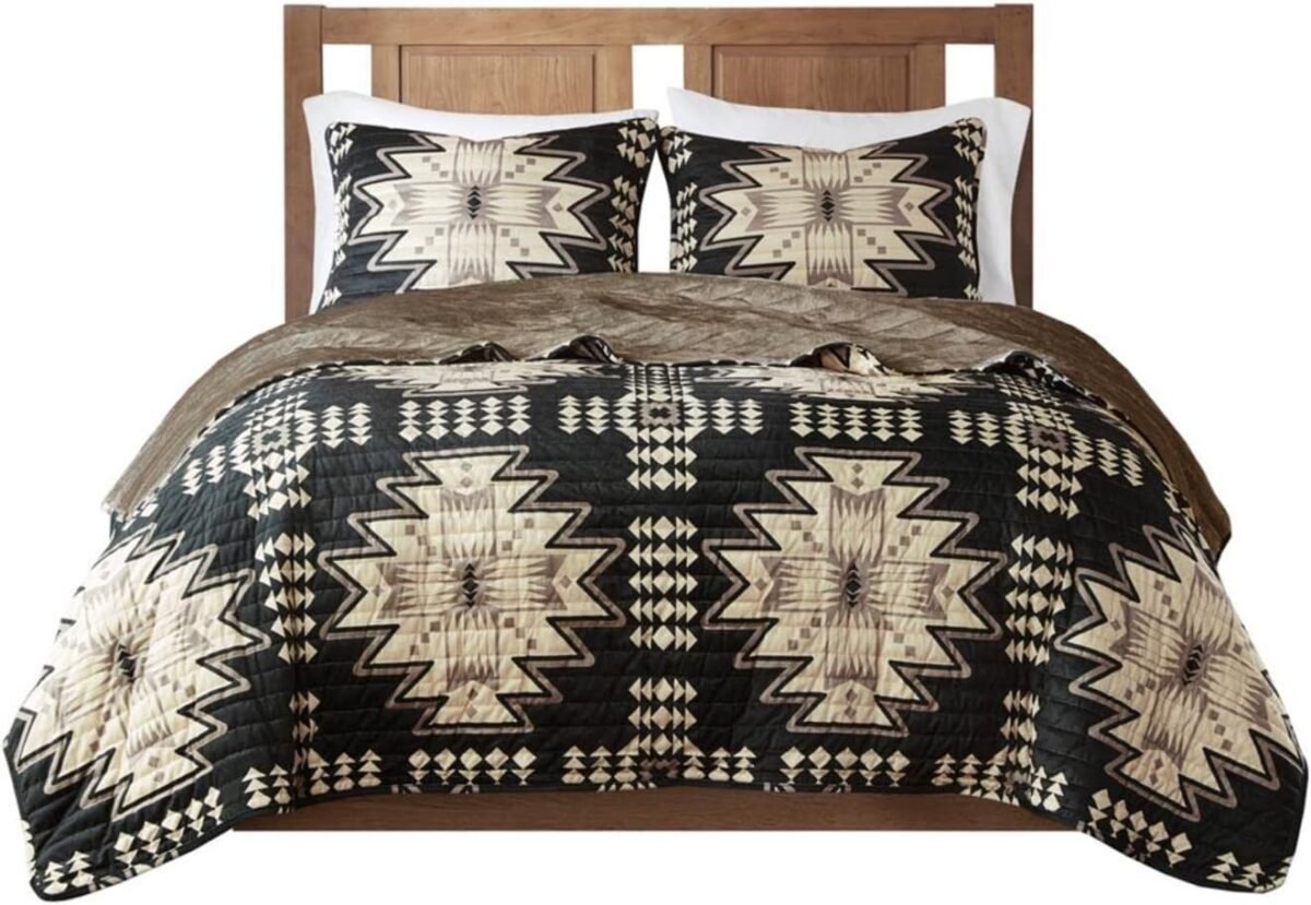 Write an article in French about: Woolrich Sierra Oversized Quilt Set – Stylish Aztec Southwestern Printed Coverlet and Matching Shams, Cozy Plush Bedding Layer with Solid Color Reverse, King/Cal King Tan/Black 3 Piece In English
